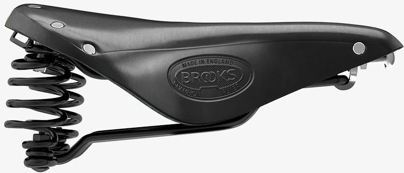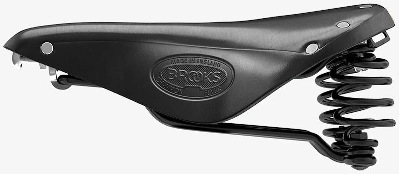La Brooks Flyer est l’incarnation de la selle à ressorts adaptée aux longues distances – ici en noir noble, ce qui fait ressortir encore plus les rivets en acier martelés à la main et l’emblématique logo. Elle combine la forme éprouvée de la B17, optimisée pour la liberté de mouvement des cuisses, avec un confort considérablement accru grâce à la suspension.